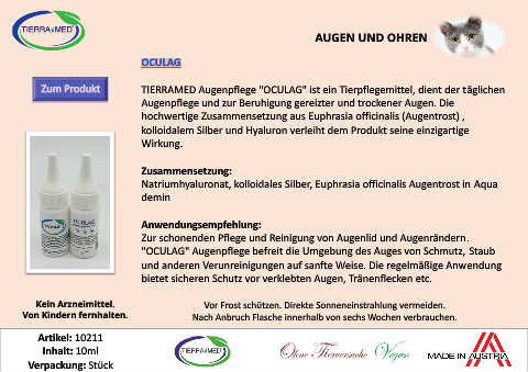 Zum Produkt TIERRAMED Augenpflege "OCULAG" ist ein Tierpflegemittel, dient der täglichen