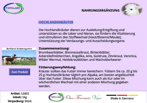 25 g Hochlandkräuter täglich pro Alpaka, am besten angefeuchtet