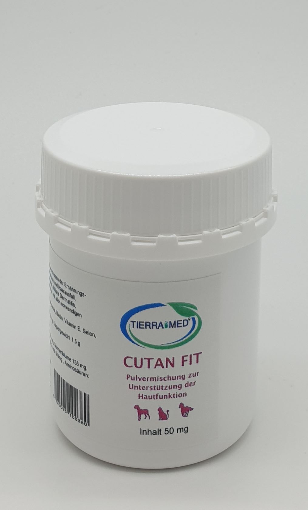 CUTAN-FIT Pulvermischung dient zur Unterstützung der Hautfunktion bei Dermatosen, Haarausfall, allergischen Reaktionen, entzündlichen Hautveränderungen, Atopische Dermatitis, Miliara Dermatitis und Haarwechsel. Die einmalige Zusammensetzung von CUTAN-FIT versorgt die Haut mit allen Nährstoffen.